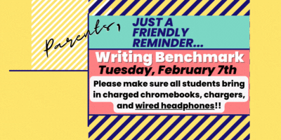 Writing Benchmark testing is tomorrow, February 7th 8am-10:45am. It is important students are present for the entirety of the benchmark. Please remind your student to bring in charged chromebooks, chargers, and headphones. They will be needed for testing purposes. Thank you for your support. Have a great week!